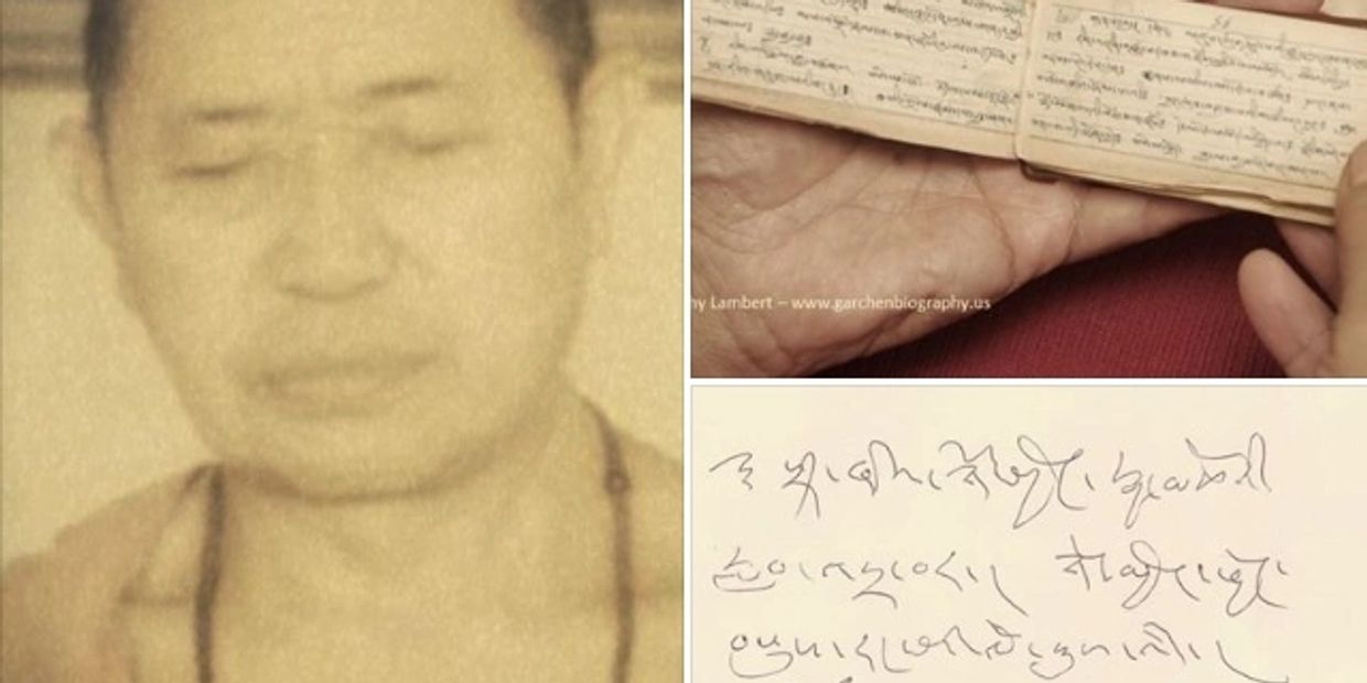 * Ghi Chú: Bức hình có chữ viết tay ở trên là do thân phụ của Garchen Rinpoche ghi lại tên và năm sanh của tất cả các con của ông. Hàng chữ đầu tiên có ghi như sau: "[không ghi tên] năm Sửu, tháng Mùi, ngày thứ 25, ban đêm, giờ chớm khuya, trăng mọc, chào đời." Do bởi khi đó ông chưa kết hôn với thân mẫu của Garchen Rinpoche, và đang cùng các anh của mình cưới chung một người phụ nữ khác theo tập tục đa phu, nên sự ra đời của Garchen Rinpoche đã không được chính thức thừa nhận. Về sau khi ông đã kết hôn với bà thì tất cả 7 người con còn lại của ông bà đều được ông ghi đầy đủ tên và năm sinh. Xin xem thêm chi tiết trong Chương 1 và Chương 2 của Tuyển Tập 1.